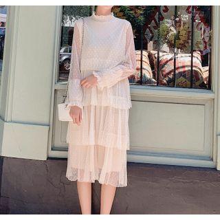 JinyoLong-sleeve Tiered Dotted Mesh Midi Dress