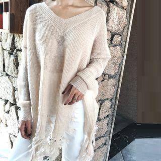 AnlayLoose-fit Irregular Distressed V-neck Sweater