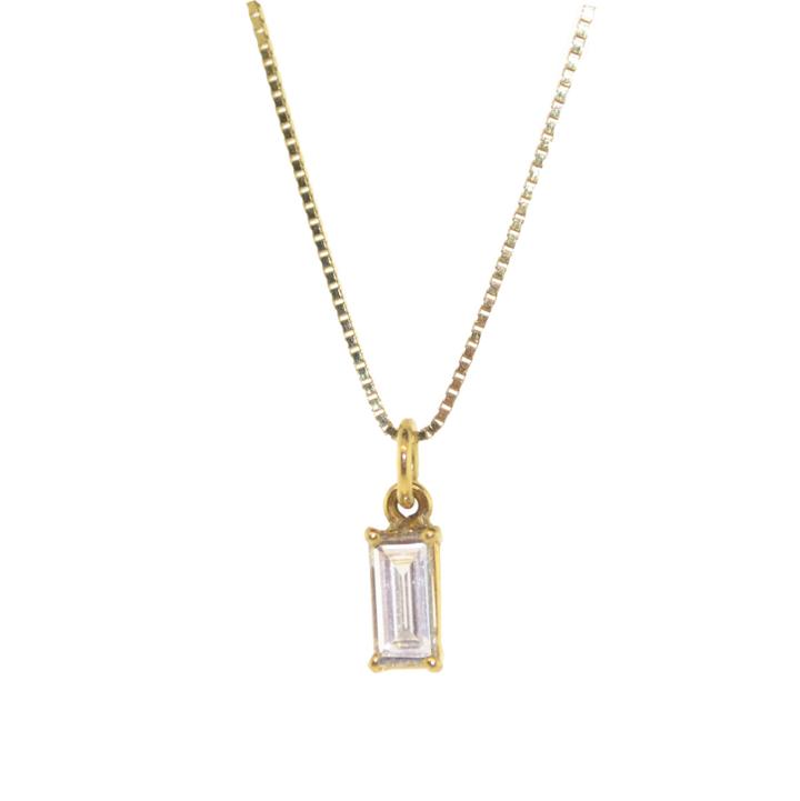 Emerald cut white diamond set into 18k gold. This 14-karat yellow gold box chain features a clasp that's attached to a silicone-lined bead that keeps the bead snug and secure on your chain but allows the bead to be slid along the chain to adjust the chain length to any length up to 22 (maximum). Includes a heart tag with a 5 x 5.5mm stampable/engravable area. Box chain has squared-off links that resemble cubes; they are sturdy chains, ideal for diamond pendants. Diamond size: 3x7mm Hand crafted in Mabel's San Francisco studio.