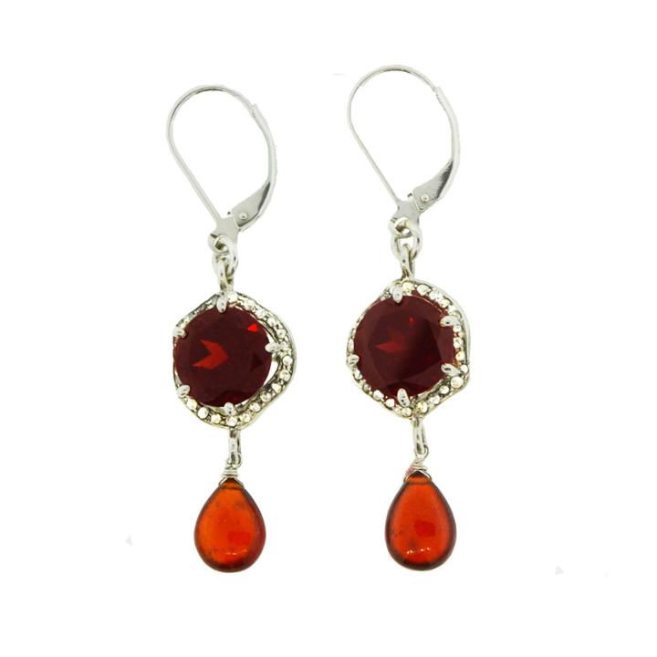Faceted Garnet set on pave diamond organic halo finished with smooth hassonite garnet pear drop. Sterling silver setting Round Garnet measures 10mm