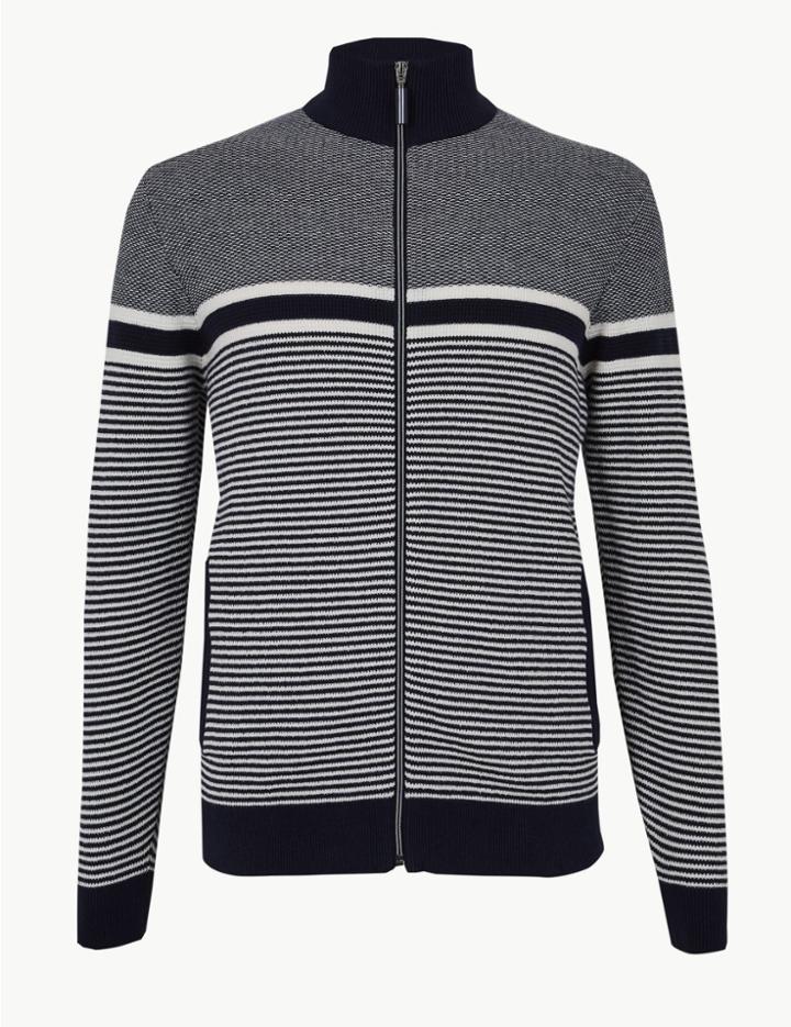 Marks & SpencerMarks & Spencer Cotton Rich Striped Zip Through Cardigan Navy Mix
