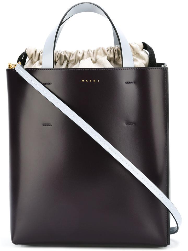 Marni strikes a careful balance between experimental and coherent. Finding inspiration in contrast and diversity, Consuelo Castiglioni's aesthetic is all about rich colours and sculptural shapes. This small Museo tote from Marni is constructed from leather and features a detachable canvas drawstring pouch, an eggplant and olive colour blocked design, a printed logo to the front, top handles, a detachable and adjustable shoulder strap, an internal patch pocket and an internal logo patch. Size