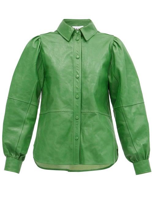 Ganni - Ganni's leather shirt arrives in vibrant leaf green, adhering to Ditte Reffstrup's confident perspective on Danish street style. It's cut to a panelled construction with a spread collar and loose, gathered sleeves tempered with push-stud cuffs. Continue the statement mood with the coordinating shorts.