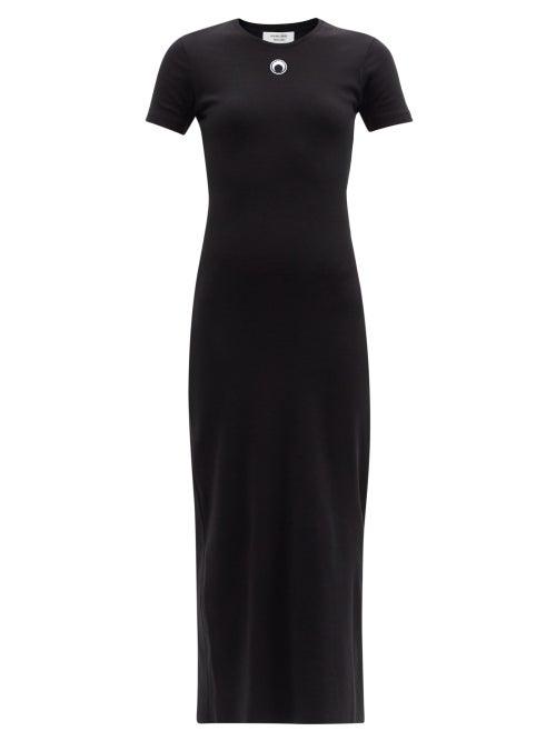 Marine Serre - Taken from the label's Borderline collection, this black T-shirt dress spotlight's the French label's off-kilter aesthetic. It's crafted from ribbed organic-cotton jersey that's blended with stretch for a body-forming silhouette and features a crew neckline, short sleeves and white embroidered crescent moon at the chest.