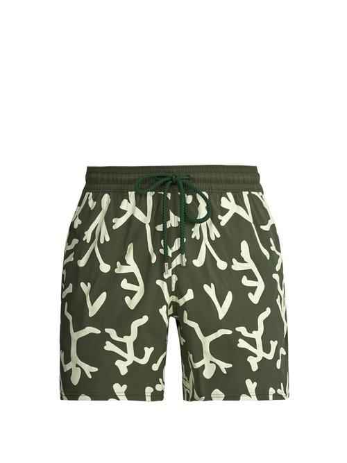 Vilebrequin - Vilebrequin's Moorise swim shorts are crafted from quick-drying brushed fabric, and patterned with a mint-green and khaki glow-in-the-dark Danse du Feu print. They're fitted with an elasticated mid-rise waistband, tied by forest-green braided-cord drawstring. The fit is true to size with relaxed, straight legs.