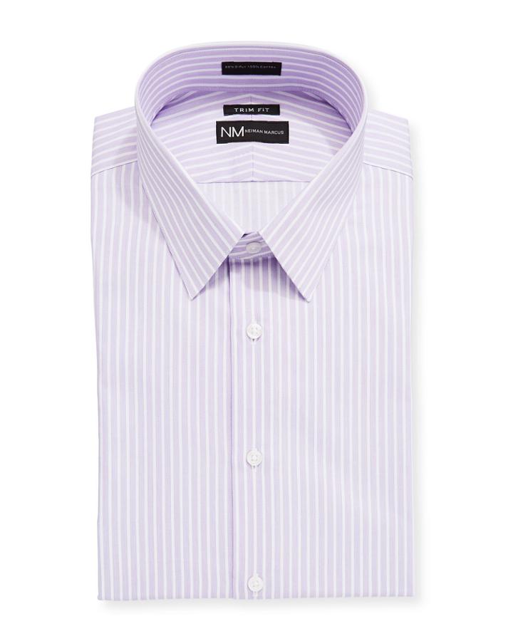 Neiman Marcus dress shirt in striped weave. Point collar; button front. Mitered cuff. Shirttail hem. Regular finish. Slim fit. Cotton. Machine wash. Imported.