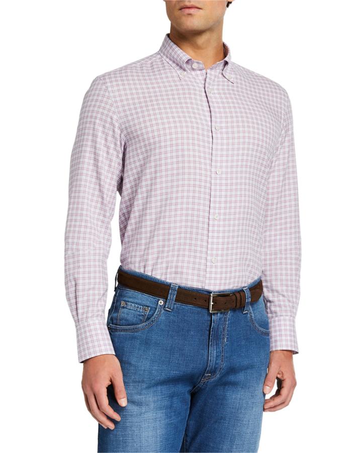 Neiman Marcus sport shirt in tattersall check. Button-down collar and button placket. Mitered barrel cuffs. Yoked back shoulders. Side pleats. Shirttail hem. Cotton. Imported.