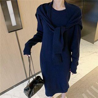 - Plain V-neck Single-breasted Long-sleeve Cardigan / Plain Crewneck Long-sleeve Dress