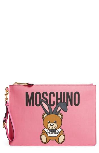 Moschino's friendly teddy bear gets a saucy update with Playboy Bunny ears on this slim collab pouch outfitted with an optional wrist strap. Style Name: Moschino X Playboy Bunny Bear Leather Pouch. Style Number: 5508134. Available in stores.