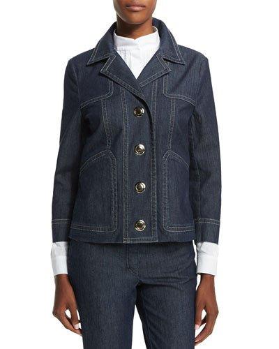 Escada New Thermal denim jacket, featuring twin-needle stitching detail. Spread collar; grommet snap-front closure. Long sleeves. Slim silhouette. Straight hem. Cotton/polyester/spandex. Made in Germany.