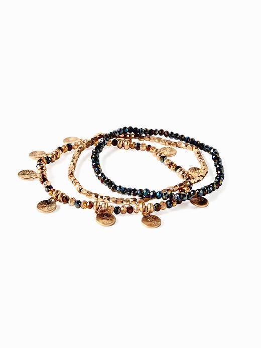 Old Navy Now this is arm candy! Three stretch to fit strands of sparkling, multi colored beads and dangling gold doubloons OK, discs are sure to upstage any escort. Pshaw! Theyre used to that by that now. Three stretch to fit strands, with sparkling beads and gold toned discs. Approximately 7.8". Bracelet 1: 95% glass, 5% rubber. Bracelet 2: 95% copper, 5% rubber. Bracelet 3: 60% glass, 20% zinc, 10% CCB, 10% rubber. Avoid exposure to water, lotion, perfume, hairspray and other harsh chemicals. Do not shower with costume jewelry. To clean, wipe with damp cloth and dry thoroughly. Not intended for ages 15 and under.