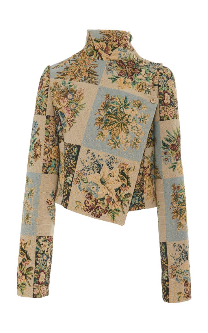 Inspired by ancient tapesties Oscar de la Renta's jacket has a floral jaccquard pattern throughout. This cropped style has a funnel neck and long sleeves. Style yours with high-waisted pants for a chic look.