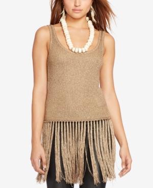 Knit from metallic yarn with rich textural allure and finished with swinging fringe trim, this sleeveless top from Polo Ralph Lauren is a chic choice for rooftop cocktails or summer concerts.