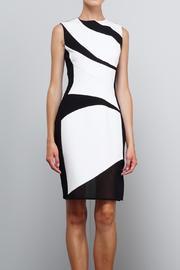 The textured ponte dress by Nicole Miller is made out of ponte, a textured heavier double-knit fabric that is soft and stretchy, in a canvas-inspired print. The front pleating is figure-flattering, and the thick shoulder straps are work-appropriate and sophisticated.