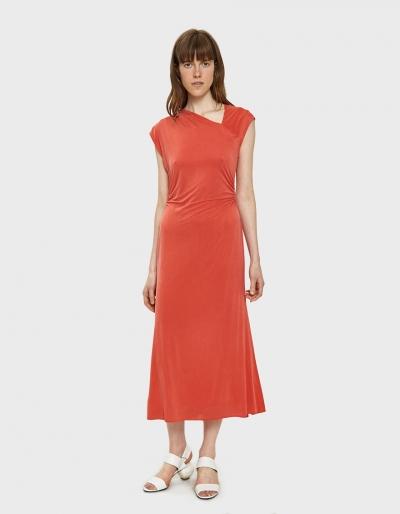 Fitted dress from Rachel Comey in Coral. Asymmetrical neckline. Cap sleeves. Concealed back zip closure. Gathering at shoulder and waist. Shirring at back waist. Gently flared skirt with back pleat creating a subtle drape. Straight hem. Mid-calf length. Italian Isotope Jersey 92% cupro, 8% elastane Dry clean Made in USA