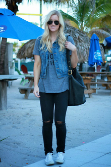 Designed to have a worn-in vibe, these skinny jeans have holes and shreds. Classic 5-pocket with zip and button closure. Approximately 35" outseam. Approximately 30" inseam. SINGER22 model is 5'9" and wearing a 25. 98% Cotton, 2% Polyurethane. Made in the USA.