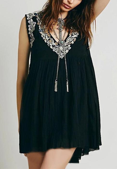 V Neck Embroidered Trapeze Black Dress.