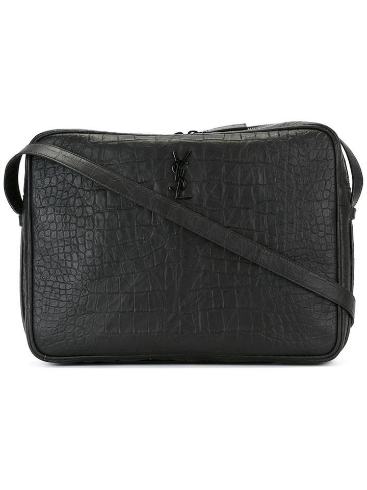 Black leather Monogram camera bag from Saint Laurent featuring a shoulder strap, an embossed crocodile effect, a back slip pocket, a front logo plaque, a top zip closure, a full lining, an internal zipped pocket and an internal logo plaque. Size: One Size. Gender: Male.