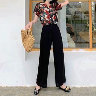 Brand from China: AYY STUDIO . Color: Shirt - Floral - Black - One Size / Pants - Black, Materials: Cotton, Size: One Size Top: Shoulder Width: 33cm, Total Length: 63cm, Bust: 86cm, Sleeve Length: 21cm Pants: Waist: 60cm-76cm, Total Length: 91cm, Hips: 116cm, Hem: 50cm, Care: N/A