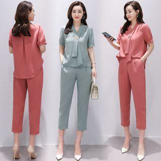 AriadneSet: Tie-neck Short-sleeve Blouse + Cropped Straight-cut Pants