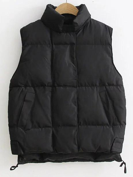 Vests Black Polyester Stand Collar Casual Zipper Single Breasted Short Winter Plain Sleeveless Outerwear.