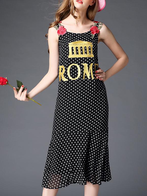 SheinShein Black Strap Applique Pouf Polka Dot Dress