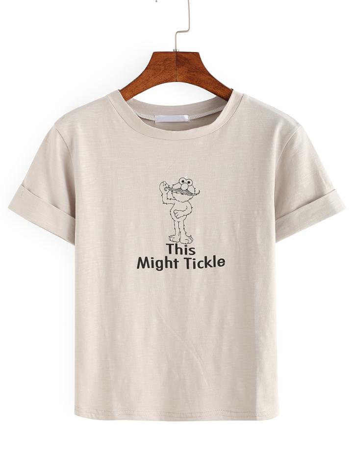 Beige Cotton Blends Casual Short Sleeve Round Neck Cartoon Fabric has some stretch Summer T-Shirts.