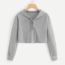 Grey Casual Long Sleeve Plain Pullovers Lace Up Fabric has some stretch Spring Sweatshirts, size features are:Length: Crop,Sleeve Length : Long Sleeve,