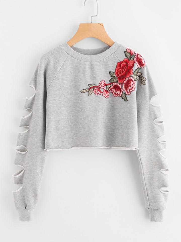 Pullovers Long Sleeve Round Neck Grey Floral Cotton Fabric is very stretchy Spring Fall Rock Regular Fit Crop Appliques Embroidery Ripped Sweatshirts.