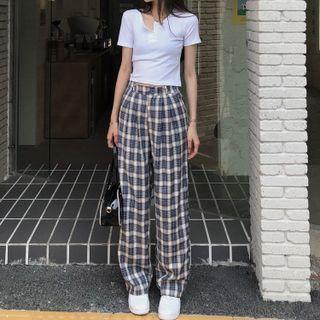 CaramelodyShort-sleeve Plain T-shirt / Plaid Straight-cut Pants