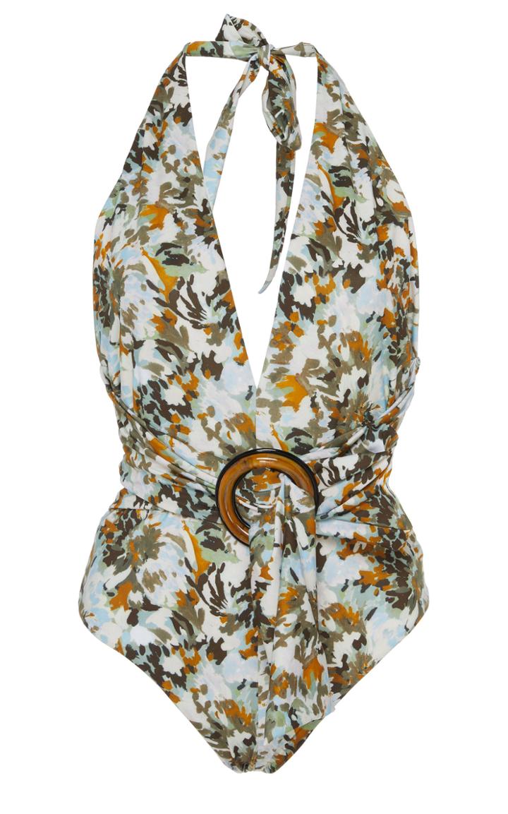 Silvia Tcherassi's 'Germain' swimsuit can be worn on and off the beach. Cut from a floral-patterned stretch fabric, it has a plunging neckline and ruching along the bodice. The buckle-fastening belt helps define the narrowest part of your waist. Wear it as a bodysuit with a flowy skirt and point-toe mules.