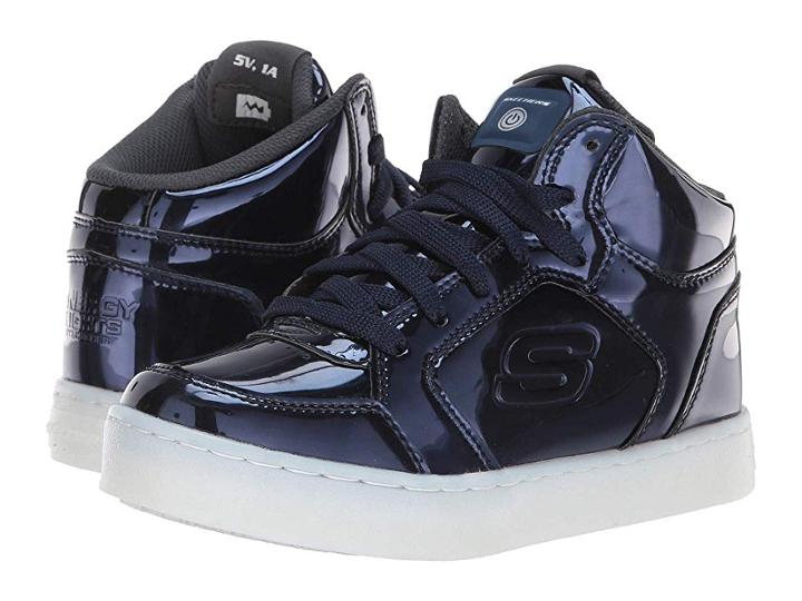 Step in style all day long in the brilliant SKECHERS KIDS Energy Lights Eliptic 90603L sneakers. Lights up with every step. Patent synthetic upper. Lace up high top classic-style sneaker design. Patent synthetic overlays at toe sides and heel. Embossed side S logo. Padded collar and tongue. Translucent midsole fully encloses bright LED lights around the midsole edge. Press the 'Start' button on the tongue and the midsole lights up in a solid red 'Red Fire' color. Lights change color with each press: Red Fire Cool Blue Alien Green Purple Teal Neon Lime White. Tongue flap reveals the Energy Lights' coolest feature - they're rechargeable! Shoes should enjoy 5 to 6 hours of continuous lighting on full charge. Plug in the included charger into any USB port and charge them up. Flexible traction outsole. Imported. Measurements: Weight: 11 oz Product measurements were taken using size 2 Little Kid width M. Please note that measurements may vary by size. Weight of footwear is based on a single item not a pair.