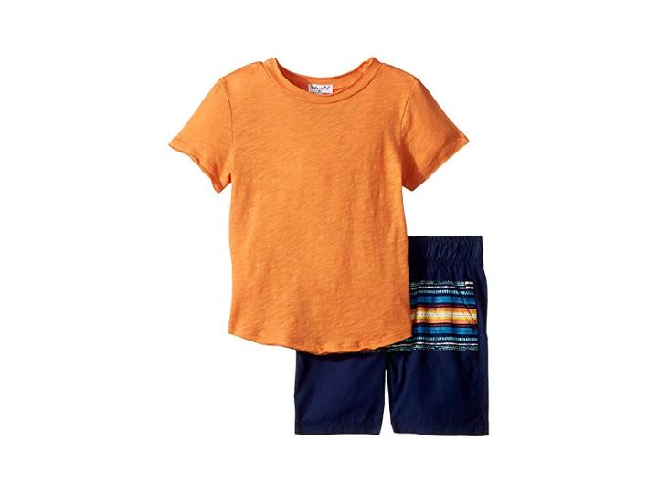 The Splendid Littles Print Short Set is a playtime pairing that's sure to be a hit! Two-piece set includes incredibly soft cotton shorts and a coordinating cotton-blend T-shirt. Shirt: Soft slub-cotton blend tee boasts a vibrant orange colorway throughout. Crew neckline. Short sleeve construction. Straight hemline. Shorts: A fun stripe pattern is featured across the front. Relaxed fit. Two front pockets. Ribbed contrast elastic waistband. Additional Information: Shirt: 60% cotton 40% modal; Shorts: 100% cotton. Machine wash cold and tumble dry low. Imported. Measurements: Length: 16 1 4 in Waist Measurement: 22 in Outseam: 11 1 4 in Inseam: 4 in Front Rise: 8 in Back Rise: 9 1 2 in Leg Opening: 6 3 4 in Product measurements were taken using size 3T (Toddler). Please note that measurements may vary by size.