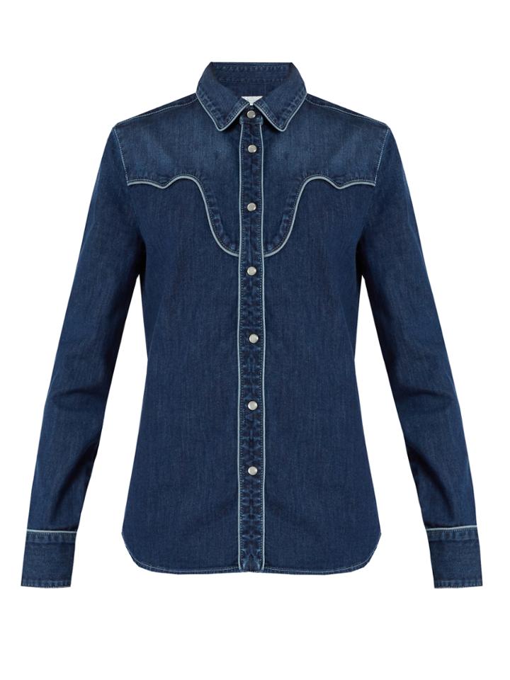 Stella McCartney looks to classic Western styles to craft this dark-blue stretch-denim Rowan shirt. Tonal-blue piping and light-blue topstitching outline the slim silhouette while pearly buttons add a stylised finish. Team it with flared trousers and a pair of the label's signature flatforms for a modern daytime look.