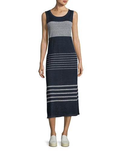 Vince stretch-knit tank dress in stripes. Approx. 50L from shoulder to hem. Scoop neckline. Sleeveless. Relaxed silhouette. Straight hem. Linen; machine wash. Imported.