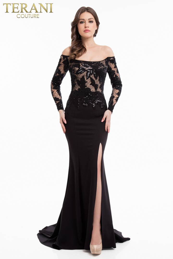 Glitter for the special occasion wearing this design by Terani Couture 1823E7358. Showcases an off the shoulder neckline with long sleeves. Sparkling sequins adorn the sleeves and fitted bodice. Highlighting your curves is a full length trumpet skirt with a high slit and sweep train. Look impeccably polished as you sweep them of their feet in this dazzling Terani Couture masterpiece. Style: terani_1823E7358 Details: 100% Polyester, Sequins, Long sleeves, Fitted bodice, Stretch crepe, Trumpet skirt, Slit, Sweep train Length: Long Neckline: Off-Shoulder Waistline: Natural Silhouette: Trumpet This special occasion dress is returnable. Please refer to our special occasion dress return policy (click here) for more details.