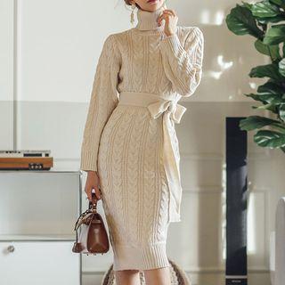 AuroraTurtleneck Long-sleeve Midi Cable-knit Sheath Dress Almond - One Size