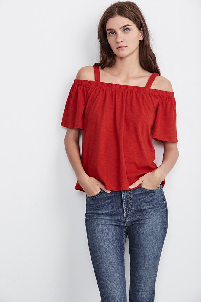Velvet ClothingVelvet Clothing Augusta Cotton Slub Off The Shoulder Tee-crimson-cotslub