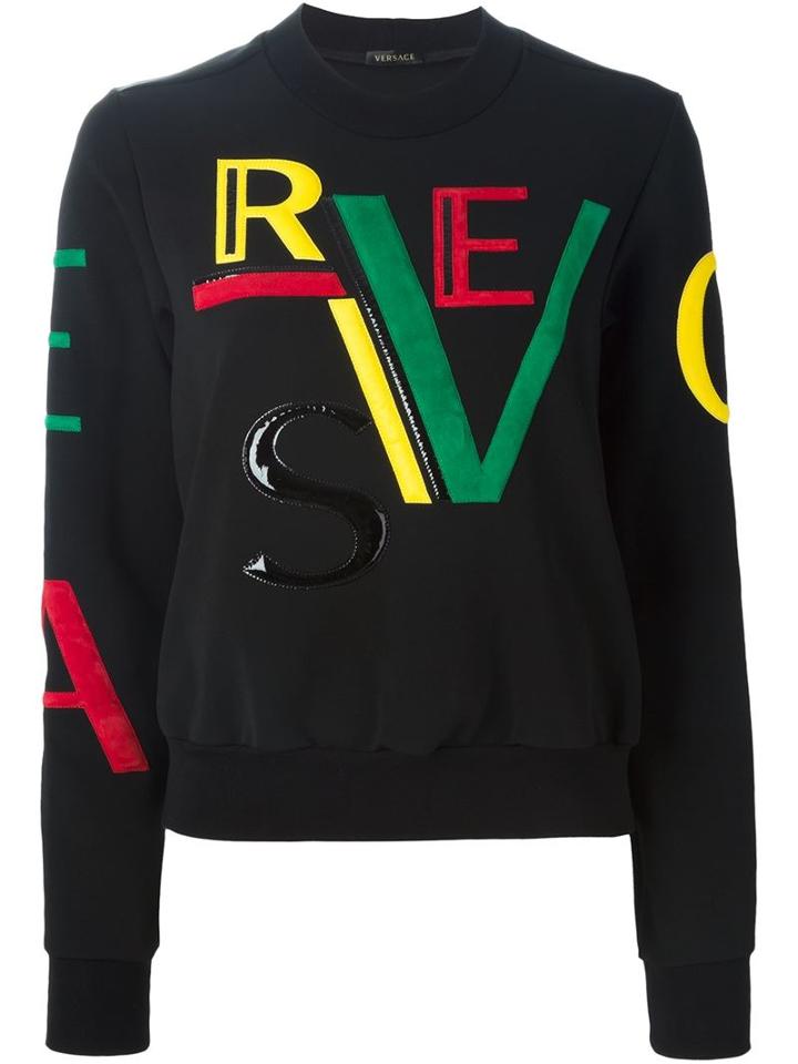 Black silk blend and leather logo sweatshirt from Versace featuring a crew neck, long sleeves, leather panels and a ribbed hem and cuffs. Size: 42. Color: Black. Gender: Female. Material: Viscose/Polyamide/Spandex/Elastane/Spandex/Elastane.