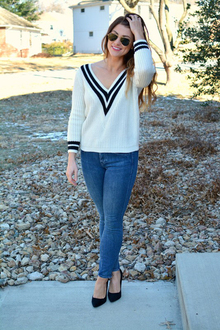 Slouchy oversized fit Banded V-neck collar Raglan sleeve Rib knit Varsity striped collar and cuffs / Dry clean