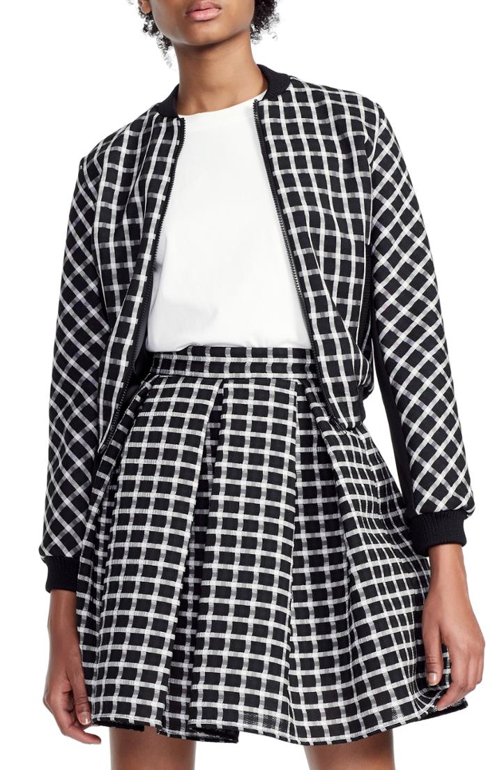 Graphic checks punch up the appeal of a jacquard bomber in a cropped cut with classic ribbed knit trim. Style Name: Maje Check Plaid Bomber Jacket. Style Number: 5733528. Available in stores.