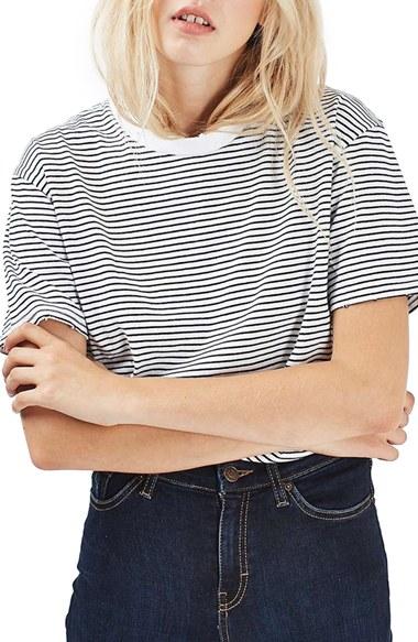 Jaunty, retro stripes define a boxy T-shirt styled with drop-shoulder sleeves for a slightly slouchy, boyish fit. Style Name: Topshop Stripe Boxy Tee. Style Number: 5752237. Available in stores.