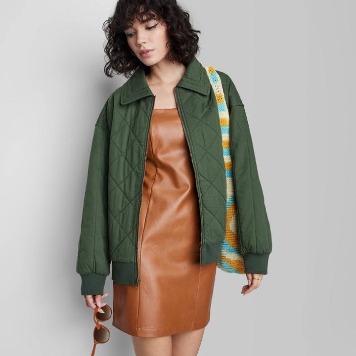 Bomber jacket from Wild Fable with a diamond-stitch quilted construction. Made from 100percent cotton with a soft lining. Sports a collared front and full-length zipper fastening, along with ribbed trim on the sleeve wrists and hemline. Designed with two functional pockets on the sides and a casual-fit silhouette that hits below the waist. Wild Fable: A look for every story. If youre not satisfied with any Target Owned Brand item, return it within one year with a receipt for an exchange or a refund. Size: XS. Color: Dark Green. Gender: female. Age Group: adult. Pattern: Solid.
